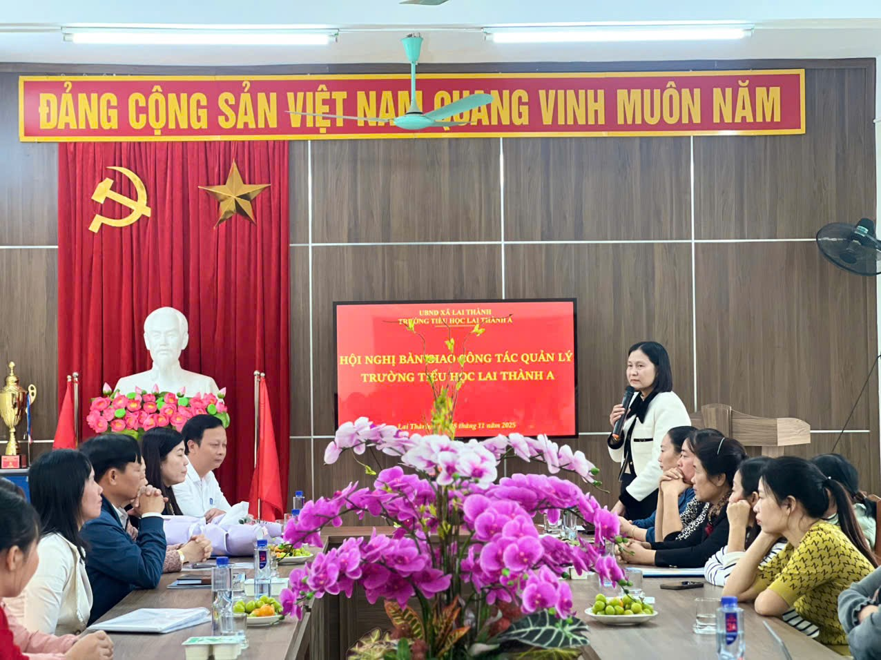 Hôm nay 28/11/2025, Trường Tiểu học Lai Thành A long trọng tổ chức “Hội nghị bàn giao công tác quản lý” nhằm thực hiện chế độ, chính sách đối với cán bộ, công chức, viên chức và kiện toàn bộ máy quản lý nhà trường. Đây là sự kiện có ý nghĩa quan trọng, đánh dấu sự chuyển giao trách nhiệm, nhiệm vụ giữa các đồng chí cán bộ quản lý, đồng thời tạo tiền đề cho nhà trường tiếp tục phát triển trong giai đoạn mới.