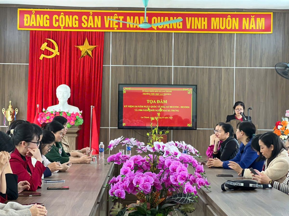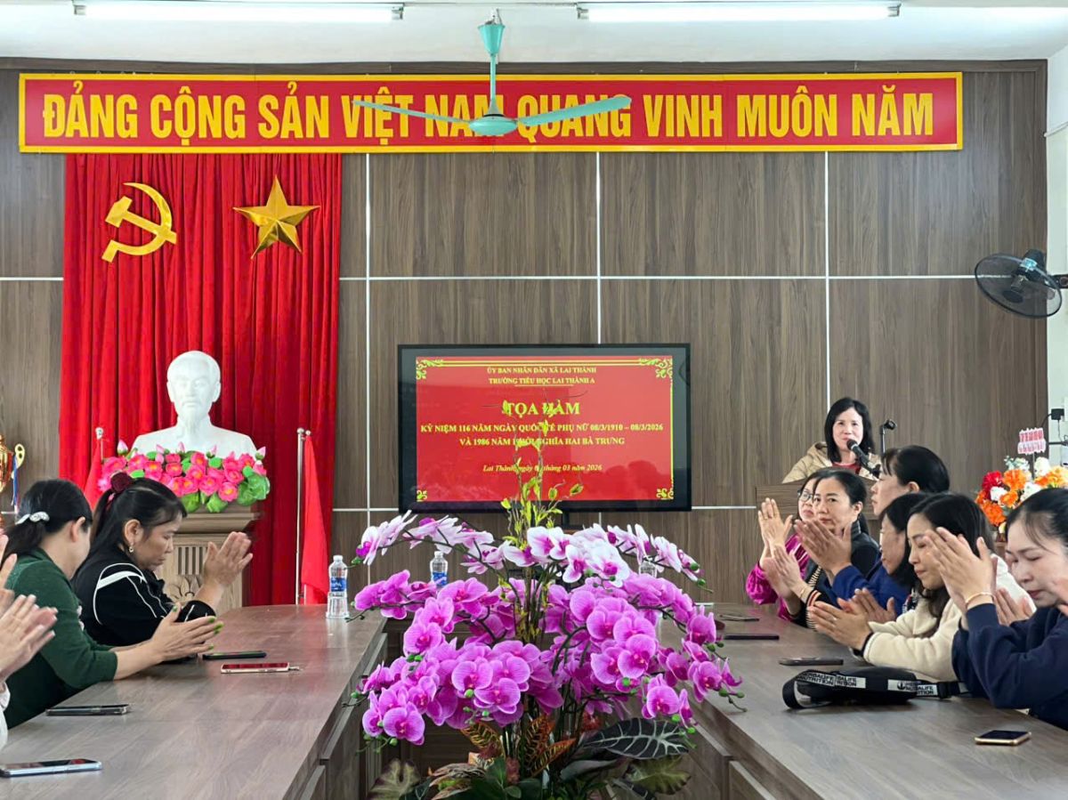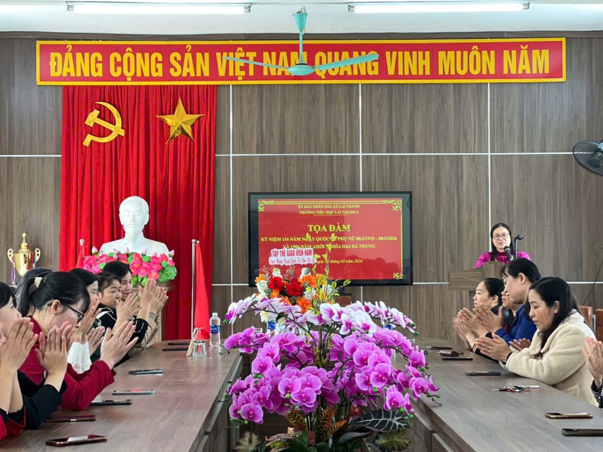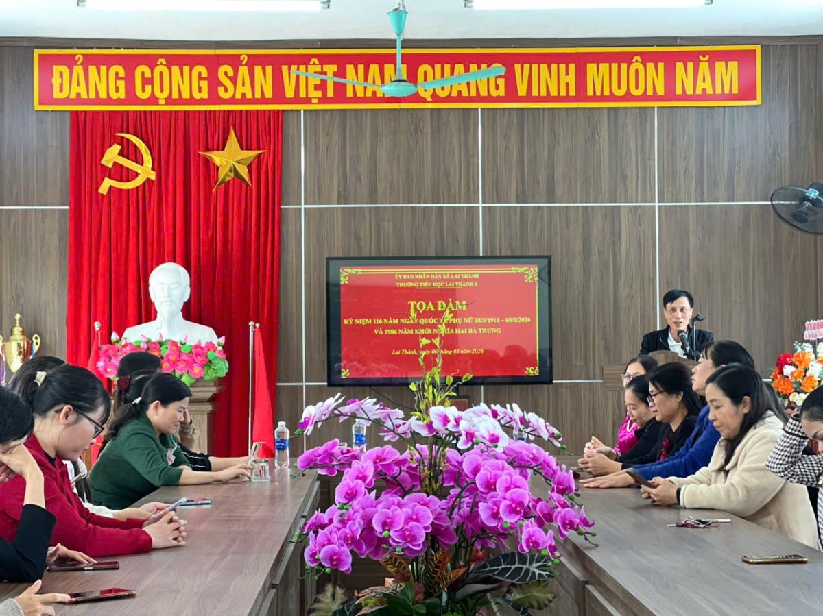 Nhân dịp kỷ niệm 116 năm Ngày Quốc tế Phụ nữ (08/3/1910 – 08/3/2026), Trường Tiểu học Lai Thành A đã tổ chức buổi tọa đàm gặp mặt nhằm tôn vinh vai trò và những đóng góp của nữ cán bộ, giáo viên, nhân viên trong nhà trường.